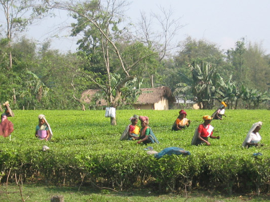インドの紅茶の生産量の3分の2を占め、世界一を誇っています。3〜6月は乾期に入り、6〜10月は雨期、11月〜2月は涼しくて乾いた気候です。今回は3月末から4月熱さを覚悟して行ったら涼しくて驚きました。気温や雨量に恵まれているためイギリス人の手により1836年より茶の栽培が始められました。1839年にはアッサム・カンパニーが設立されアッサムに多くの茶園が作られ現在では850茶園あるそうです。