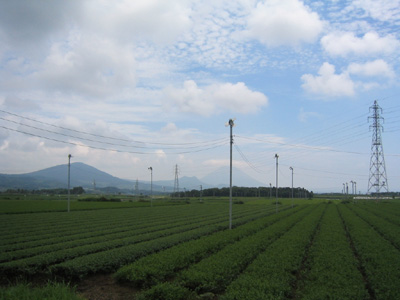 はるか後ろに開聞岳が見えます。 今までいろりろ日本の茶園を訪ねて行きましたが、日本の中にこんなに広い茶畑があるとは思えないぐらい大規模な生産体制でした。