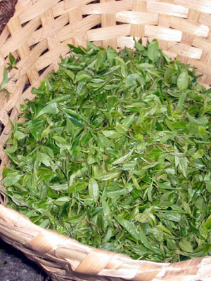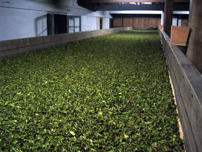 朝と夕刻に摘まれた茶葉が別々に萎凋溝に入れられて萎凋(水分を取るためにしおらせます)させます。それをマネージャーが何度チェックし朝何時から工場で揉捻するかが決められます。その状態が見たくてわがままをお願いし私たちも工場に出かけました。これが十何時間たった茶葉です。工場の周りに行くと本当にいい香りが立ち込めています。中に入ると揮発性の芳香が清々しく眠い目も覚めてしまいます。