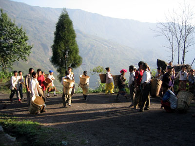 部屋に戻り少しベットに横たわると7時にファクトリーの前にあるドラが鳴ります。今まで何度もこのゲストハウスに泊めていただきこのドラは朝の仕事初めと勝手に思い込んでいましたが、皆さん家に時計がないので時間を知らせるため何度も鳴っているそうです。朝とお昼しかまったく気がつきませんでした。 7時にドラがなるとグムテに働いている茶摘の方々が家からこのように集まってきてグループを組んで仕事に出かけます。それはエリアで日当たりや品種が異なるためです。そのためエリア別で茶の計量も分けて計量するし、グループも細かく、茶を摘む速さなどでも分けるのは同じ製茶のロットの条件を整えるためです。細かい配慮がいろいろなされています。