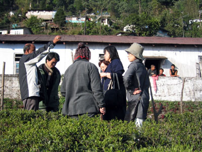 茶摘の女性たちが計量にファクトリーに戻ってきました。朝7時からお昼までと午後から夕刻までと2回茶摘の方たちは計量するためにファクトリー(製茶工場)にこのように戻ってきます。到着してお茶を頂いた後直ぐに工場に出かけました。といってもグムテのゲストハウスは、ファクトリーから歩いて3−4分のすぐ近くにあります。