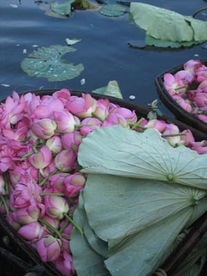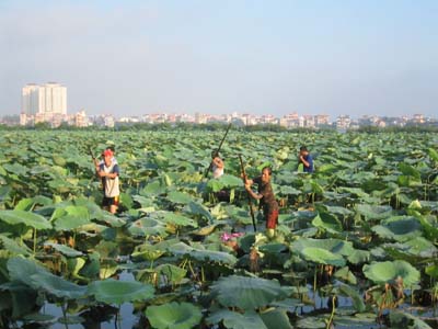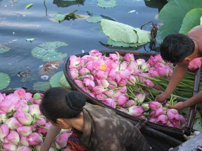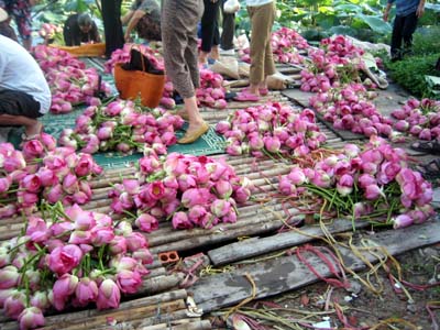 ここハノイでは、6月おわりから8月一杯が蓮の季節でとくに7月の蓮の花で作るのが最高ときいて今回は7月に出かけました。早朝5時頃から蓮取りに出かけ6時頃には戻ってくるそうです。