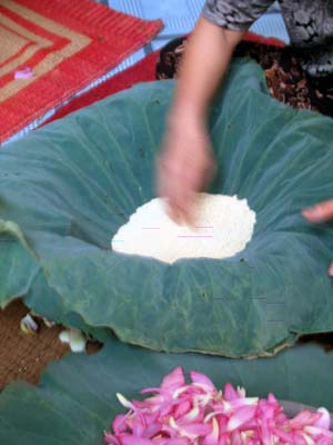 花は仏さんに飾るのは茎が長く、お茶の香りに使われるもの茎を20Cm程度で切って摘まれています。蓮の花のしたに葉を引いてまた上から蓮の葉で覆ってきます。花の香りを本当に気を使って丁寧な取り扱いをしていました。たまたま行った日が旧暦で仏様に蓮を祭るときだったそうでたくさん長い茎がある蓮が船に乗っていました。