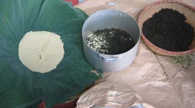 はずしたおしべ、そしてベトナムの緑茶(代表的な茶の産地のタイグェン地方)とこのおしべを真ん中のお鍋に重ねてなんども繰り返し重ねてゆきます。おしべと茶葉を混ぜ紙の蓋をして1日置いておきます。翌日400Gずつ中にトレ−シングペーパーが引かれたクラフトの袋にいれしたから炭火で暖めた金属のトレイにおいて乾燥させます。炭火感想は1日8時間2日繰り返します。 そしておしべを取替え乾燥します。おしべの取替えを5回繰り返すそうです。 ですから香り付けに15日間かかるそうです。