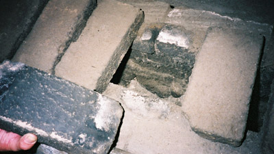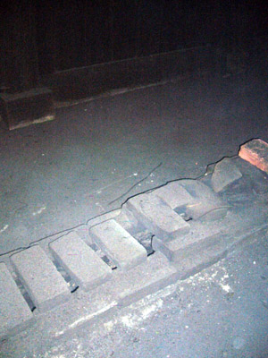 建物の一階部分の床です。このように溝が縦に走っていて底を外の火の炊口から暖かい空気が流れるようになっています。その上にレンガが並んでいます。これは並べている隙間を空けたりつめたりして間隔を調節し温度をコントロールするそう です。