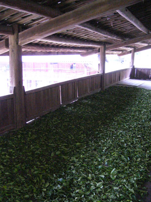 そこから移動しまして2階に上がります。建物にはテラスのような部分があります。ここをうまく使っています。半日陰のところでそこの上に1芯3葉で詰まれた茶葉を屋外萎凋します。これはインドやスリランカの紅茶ファクトリーでは見たことがありません。烏龍茶を作るときは香りを作る行程として大変意味がありここの紅茶が独特の龍眼の香りがするのは土地の持つ土や環境だけでなく製茶にも関係あるように私は思っています。