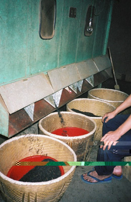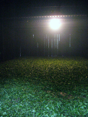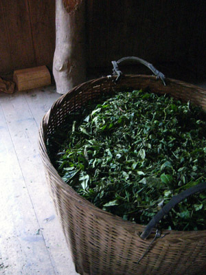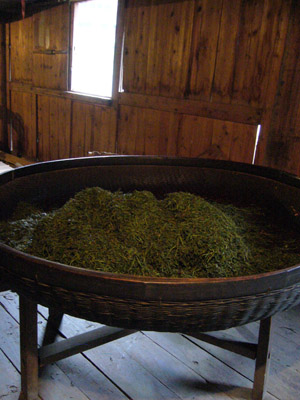 屋内萎凋、2階の床に竹で編んだ筵というか茣蓙というか敷物を床に引きます。そのうえにお廊下のベランダで屋外萎凋した茶葉を広げます。ここは1階ほどではありませんが加温されているので温度が調整されていてドアを開けて写真をとると曇ってしまいます。念のために!ここの特別保護区の中では木を切ることは許されておりません。ですから他の場所からトラックで木を運んできます。むかしから武夷山は竹と松が多く生えているところだったそうです。ですから寒いで松の木で加温して発酵させたそうです。