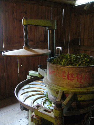 揉捻機。3回揉捻しますが、まず1回目軽くゆっくり揉みます。そのあと玉解して塊をほぐします。また2回目の揉捻をします。